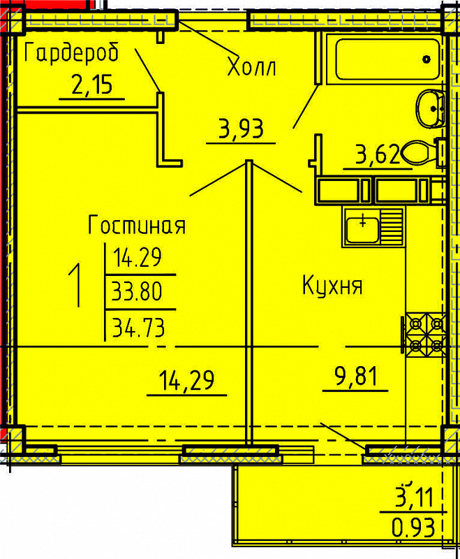 1-комнатная, 33.58 м²