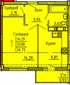 1-комнатная, 34.34 м²