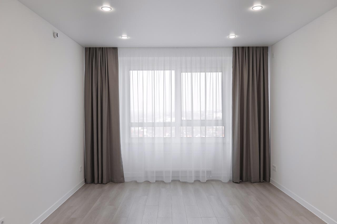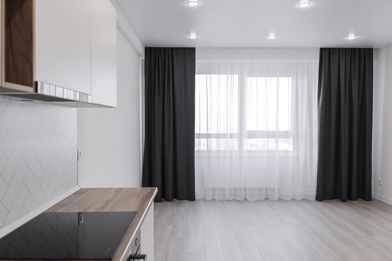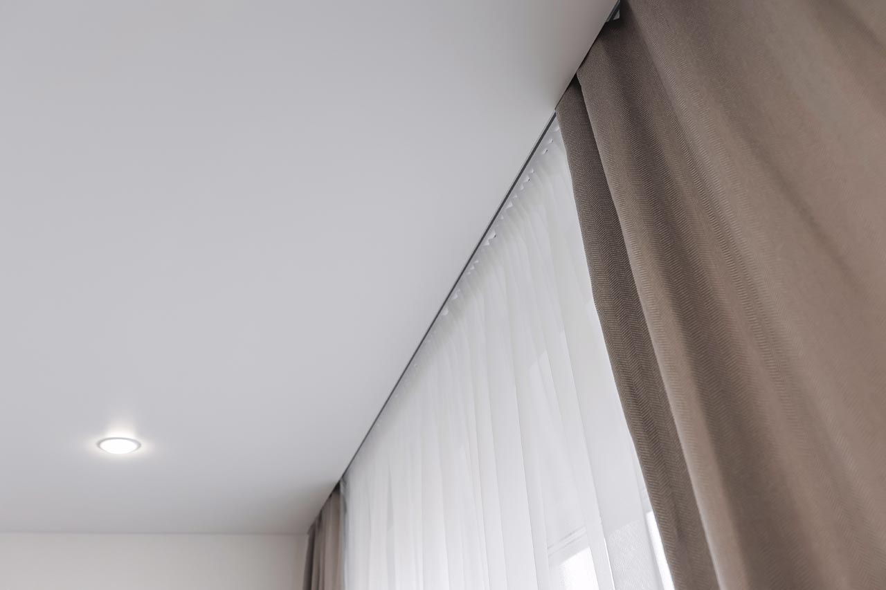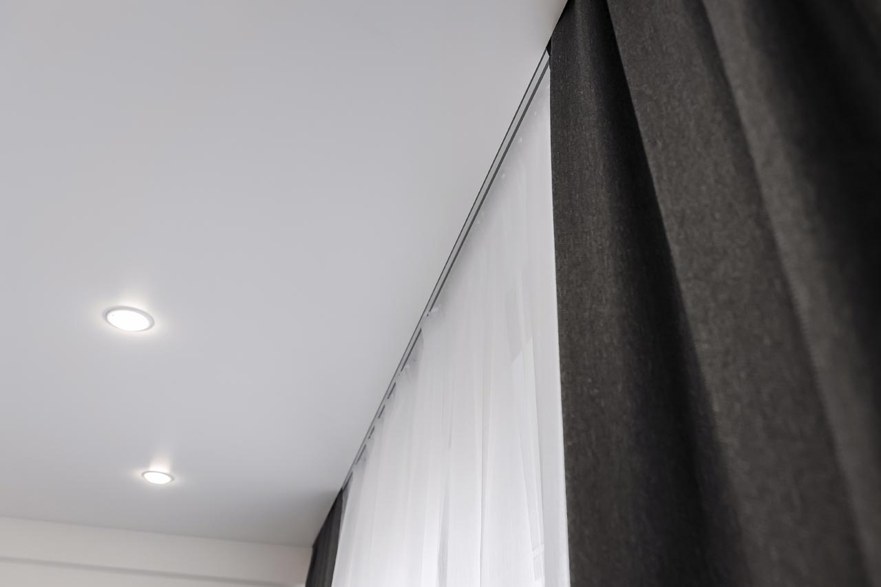 - Натяжные потолки с точечными светильниками, еврокарнизы для штор, двери с повышенной шумоизоляцией.